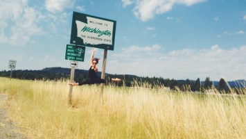 Not long after Coeur d’Alene I found myself crossing into the state of Washington! Already?! I couldn’t believe I had already found myself in Washington. My smile was bigger than my cheeks had room for. : ) I eagerly waited and watched for the Welcome sign and was quickly disappointed when one was not found. Pulling off I-90, I ventured into a tiny gas station to figure out what the situation was. A sweet elderly man was reading a newspaper when I asked him. He cheerily smiled at me and said, “Oh honey, it was on the bridge! You had to look up to see it.” Not the sign I was looking for. I explained to him how I needed a photo by each state sign so that wasn’t exactly feasible for my project. He thought for a moment, then mapped out an alternative route to a sign that was off the backroads. I thanked him deeply and made my way back towards Idaho to find my Washington sign. Sure enough, a few miles east there was a tiny sign with the most beautiful words I have read, “Welcome to Washington.” I whipped a U-Turn and set up for the best and final photo of my trip.