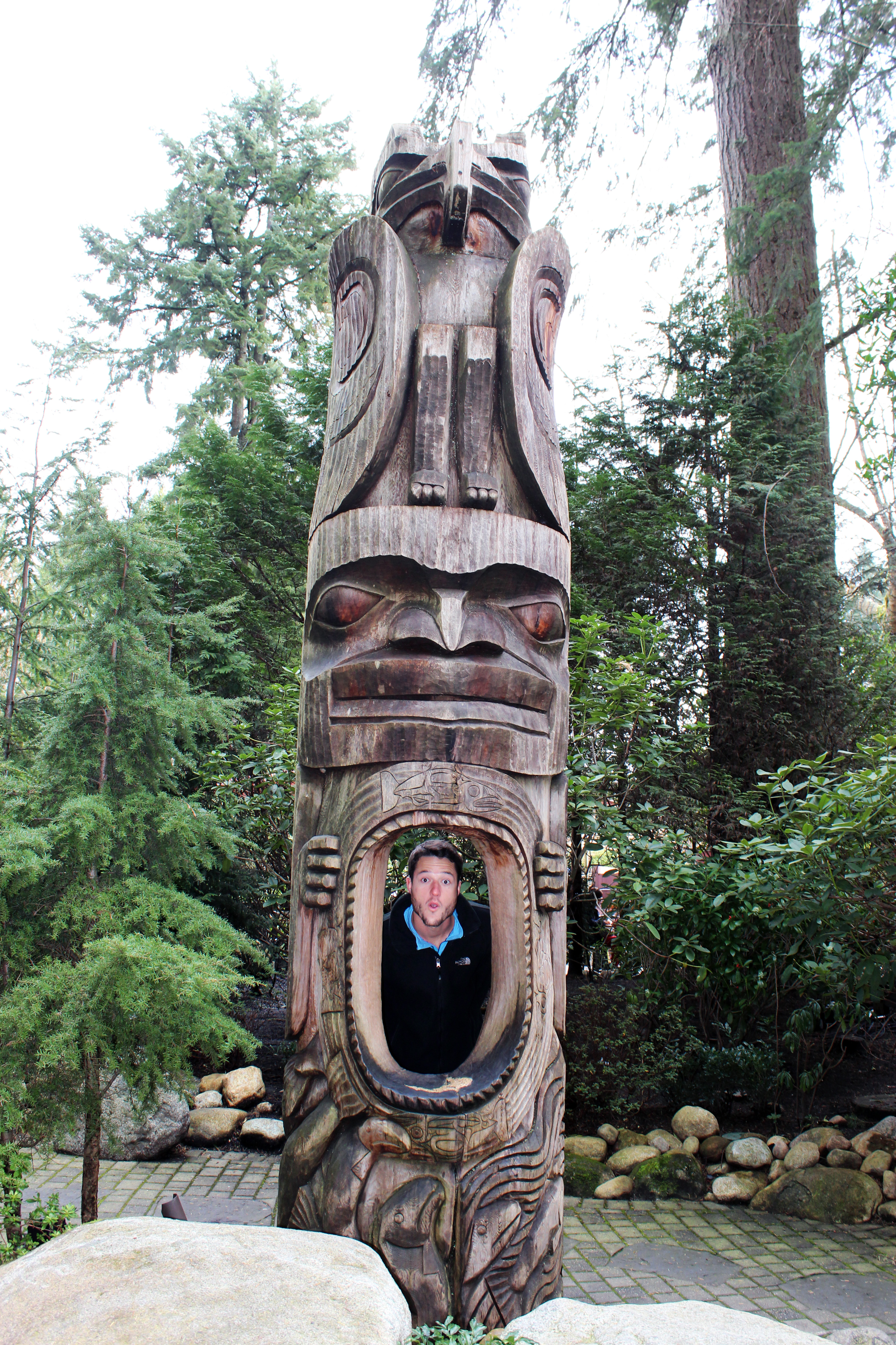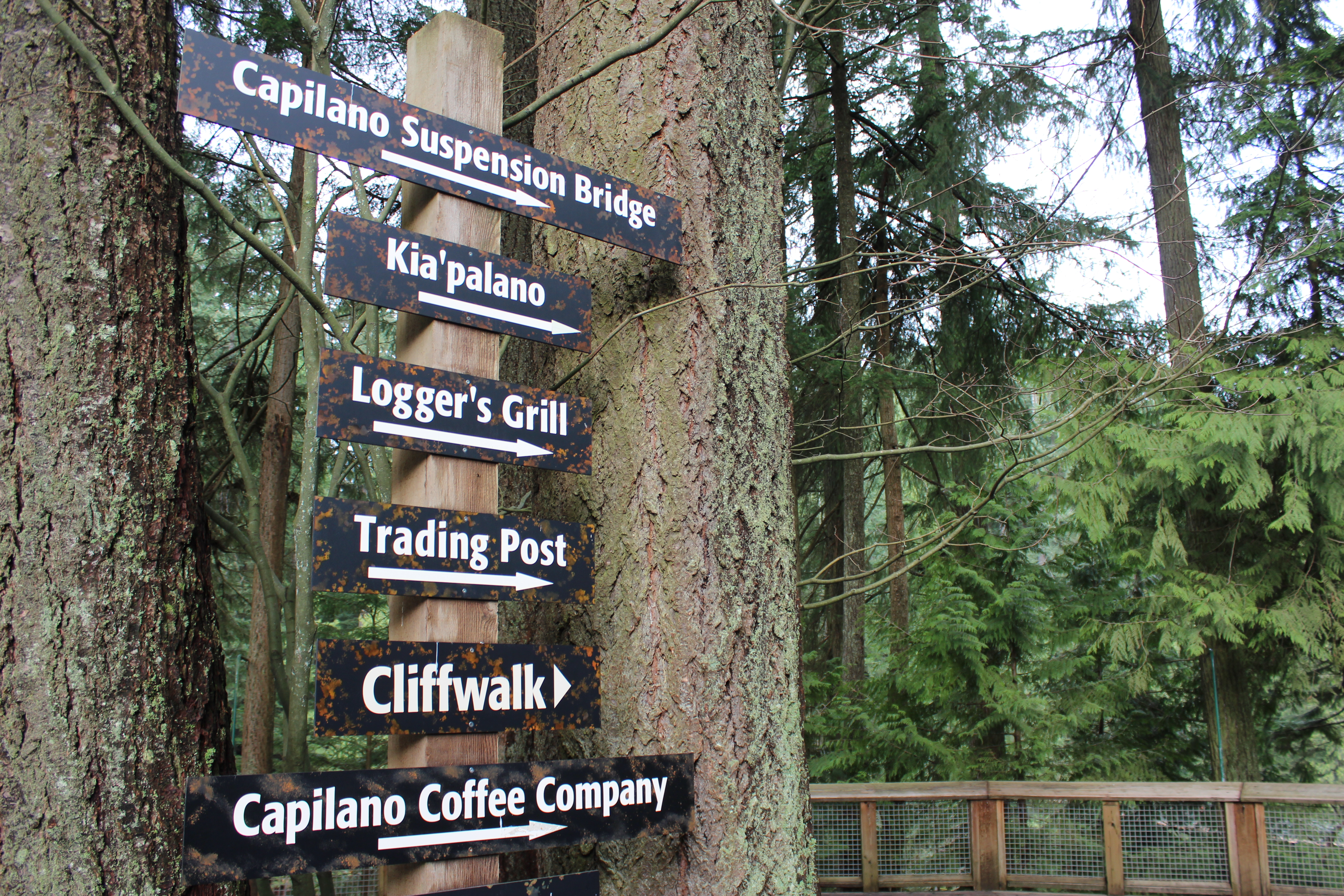 Off we went, with only a slight detour- Canadian roads are confusing- twisting around the outskirts of Vancouver, through North Vancouver and finally arriving at a dirt parking lot labeled “Capilano Suspension Bridge Parking.” Grabbing our parking permit and tickets we raced inside the venue in hopes of passing in front of the large busload of tourists that had just pulled up. We were surprised to see that inside there was actually a bunch more things to do other than just the suspension bridge. Although amazing to see, I’m not sure it would be worth the cost to just see that. We noted that the suspension bridge was awfully busy so we decided to venture around the other aspects of the park first.