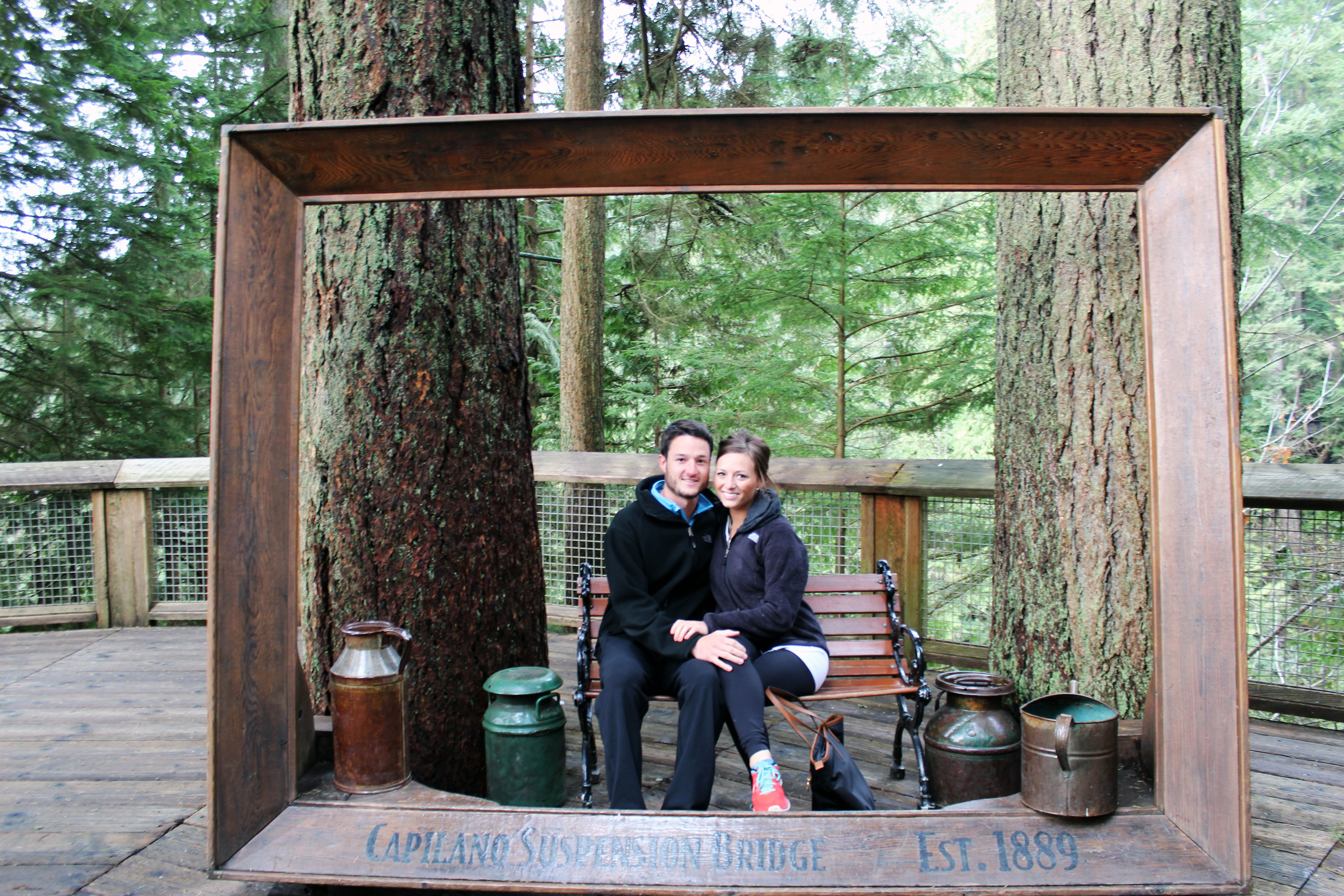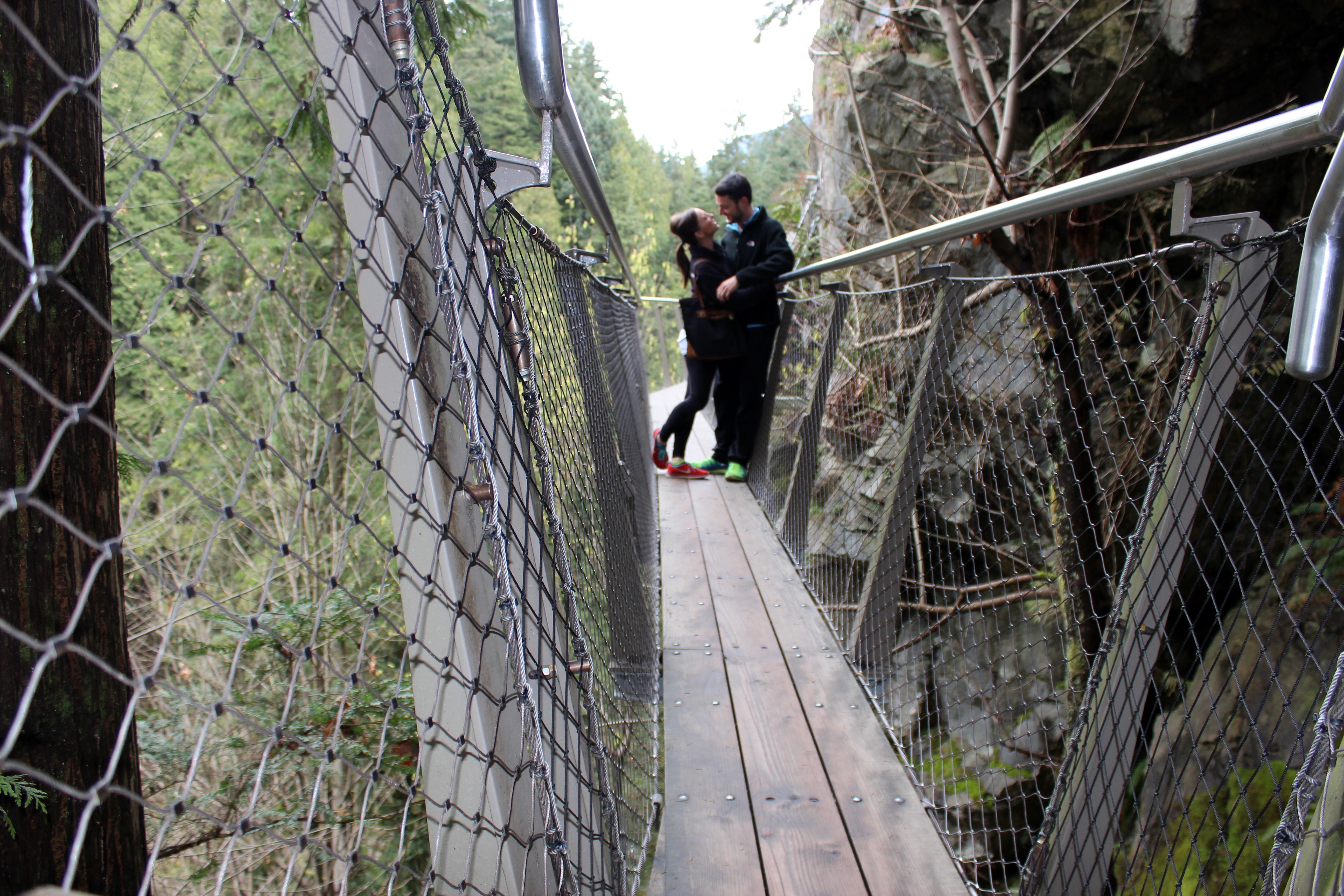 Making our way through the “Story Centre” and through the Giftshop we started our adventure on the Cliffwalk. The Cliffwalk follows a granite cliff over looking the Capilano River. Walking along, we crossed bridges, climbed stairs and hung out on platforms overlooking the gorgeous Evergreens and forest. It was neat to be up so high and what I enjoyed was that we were basically alone for the first bit of our adventure. There weren’t many tourists crowding us so we could take our time along the Cliffwalk, taking in the nature around us. Dave noted several times how fresh the air. It was true, both of us living in such large cities we get used to the polluted and human infested air, but out here in the midst of the Rainforest- it was so clean and fresh. It felt different even just to breath.