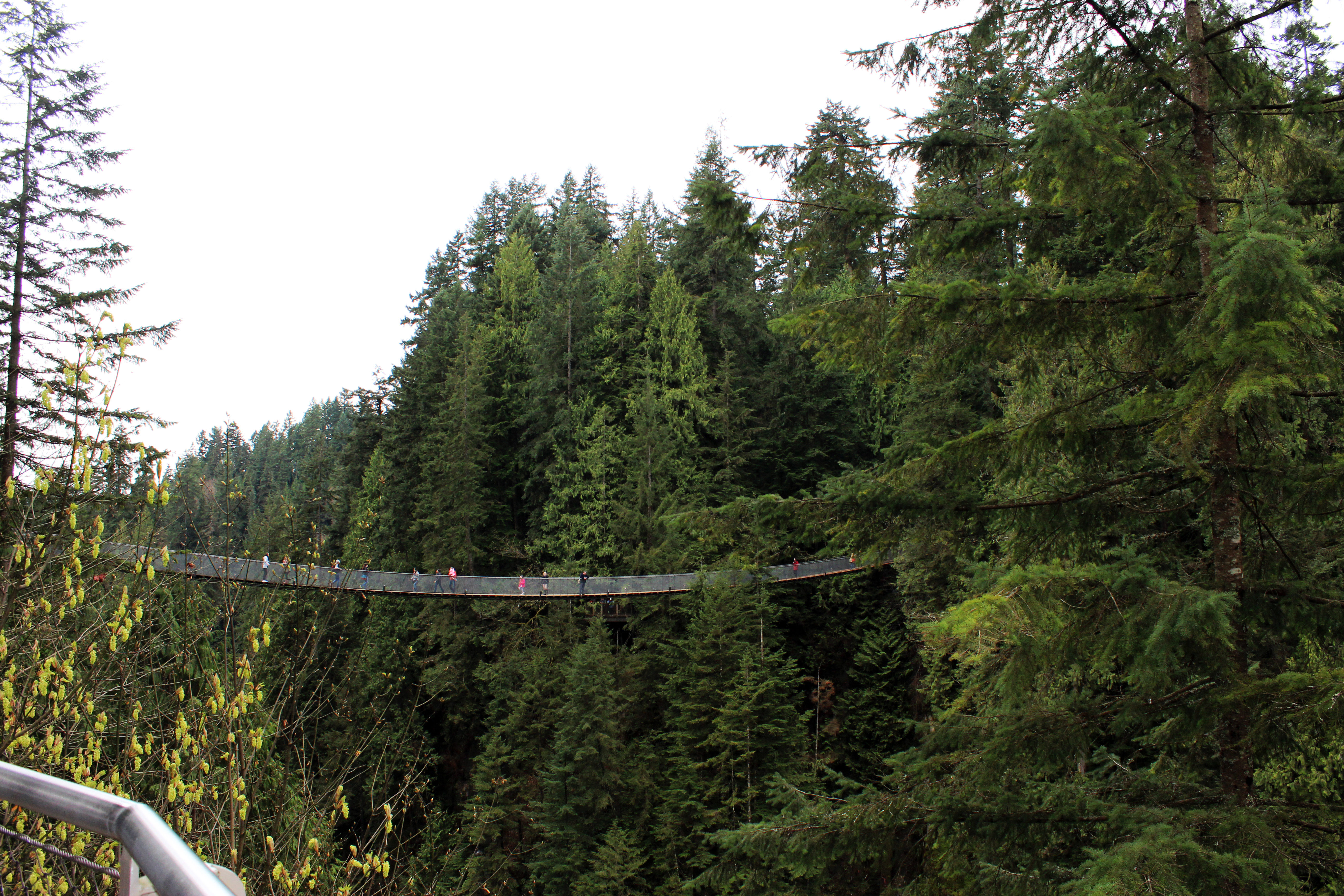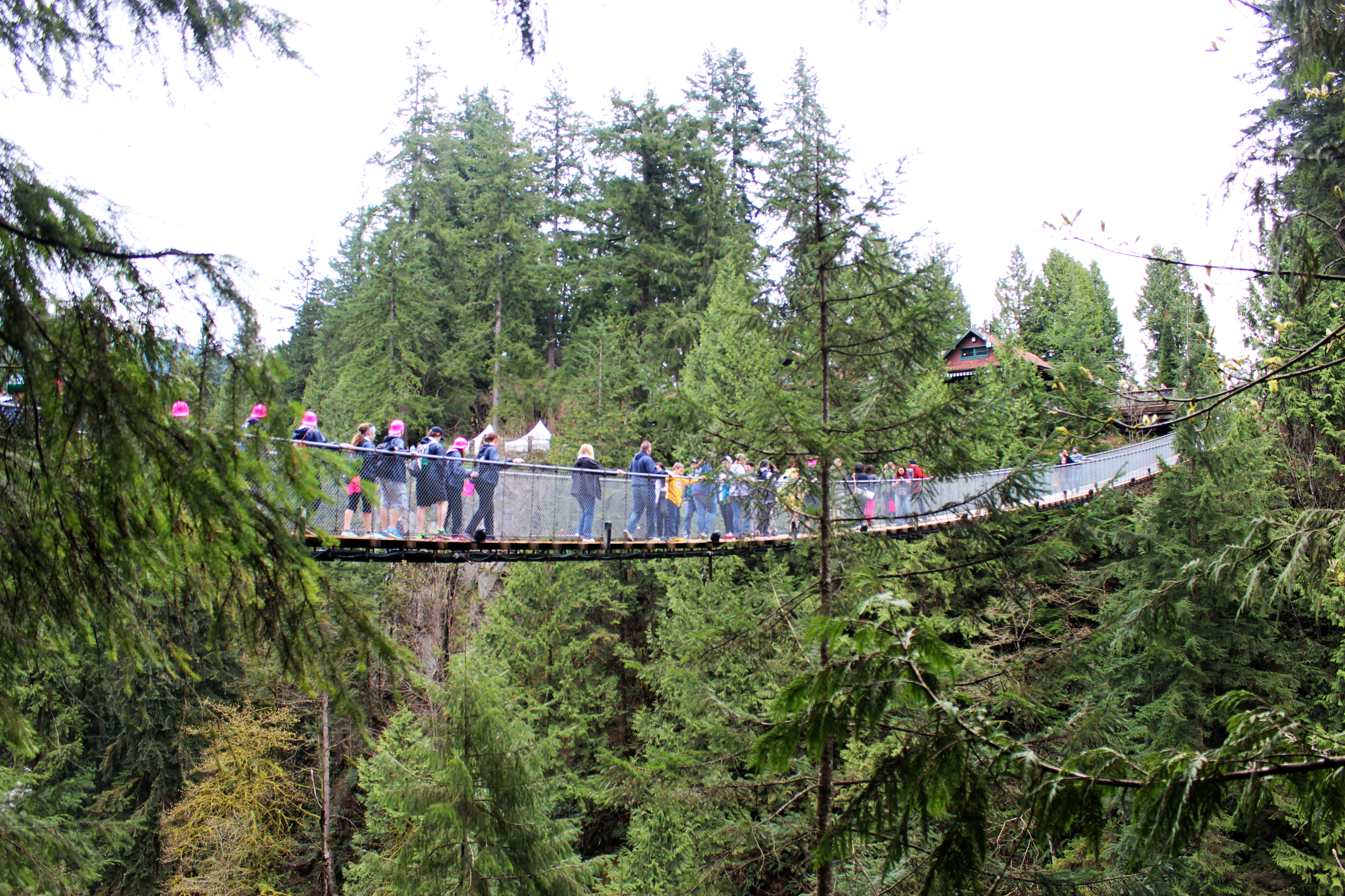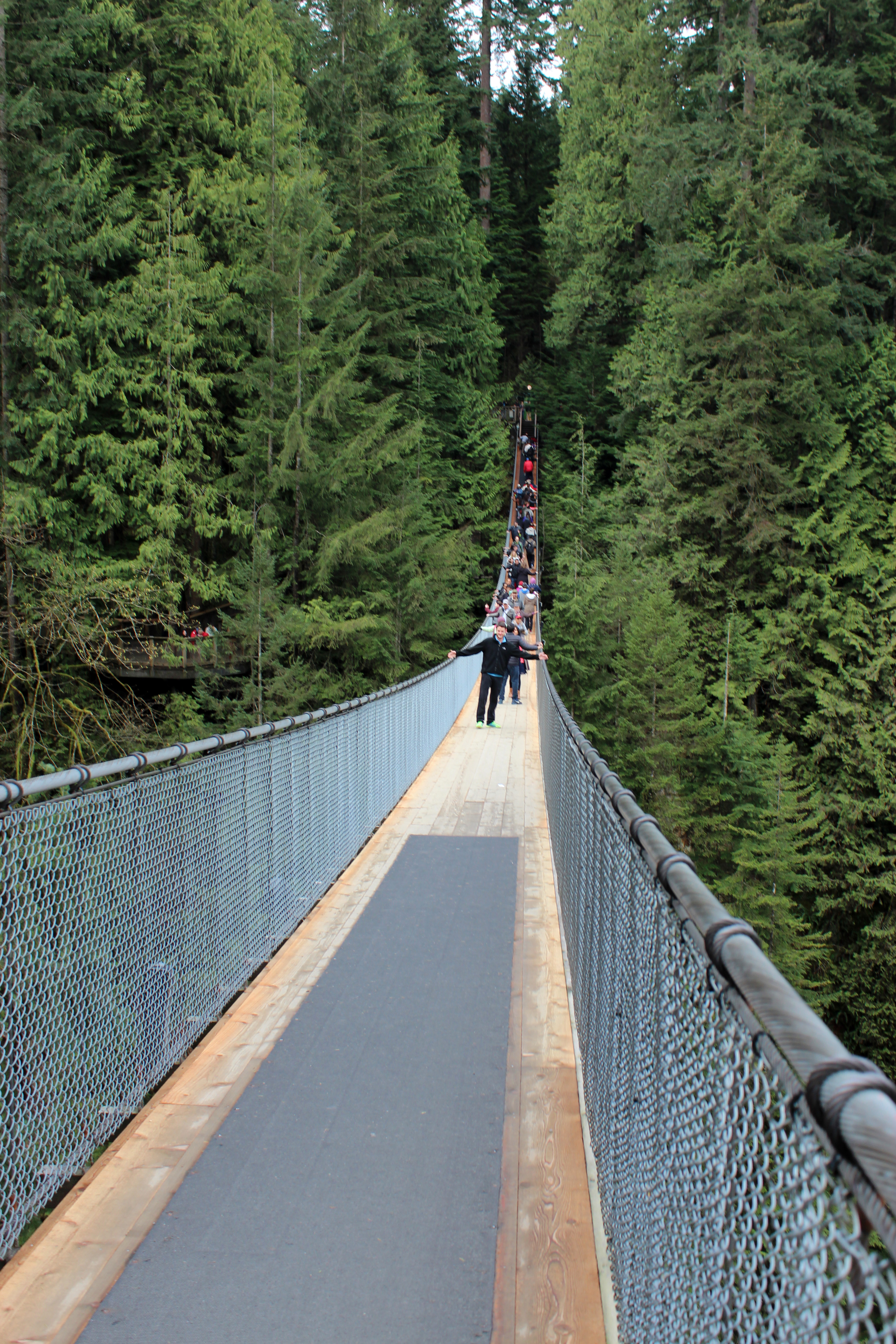 We finally decided that as the day went on, the Suspension Bridge wouldn’t get less crowded so we might as well just take our time crossing. I could already see the nauseous-ness coming before even stepping on the bridge. The Capilano Suspension Bridge was built in 1889 and stretches about 450 feet across the Capilano River. And let me tell you, it’s quite high above the river too, about 230 feet. With those kinds of dimensions it’s no wonder you get a little queasy and wobbly when you step on the bridge. Getting photographs was proving to be quite challenging but we made due.
