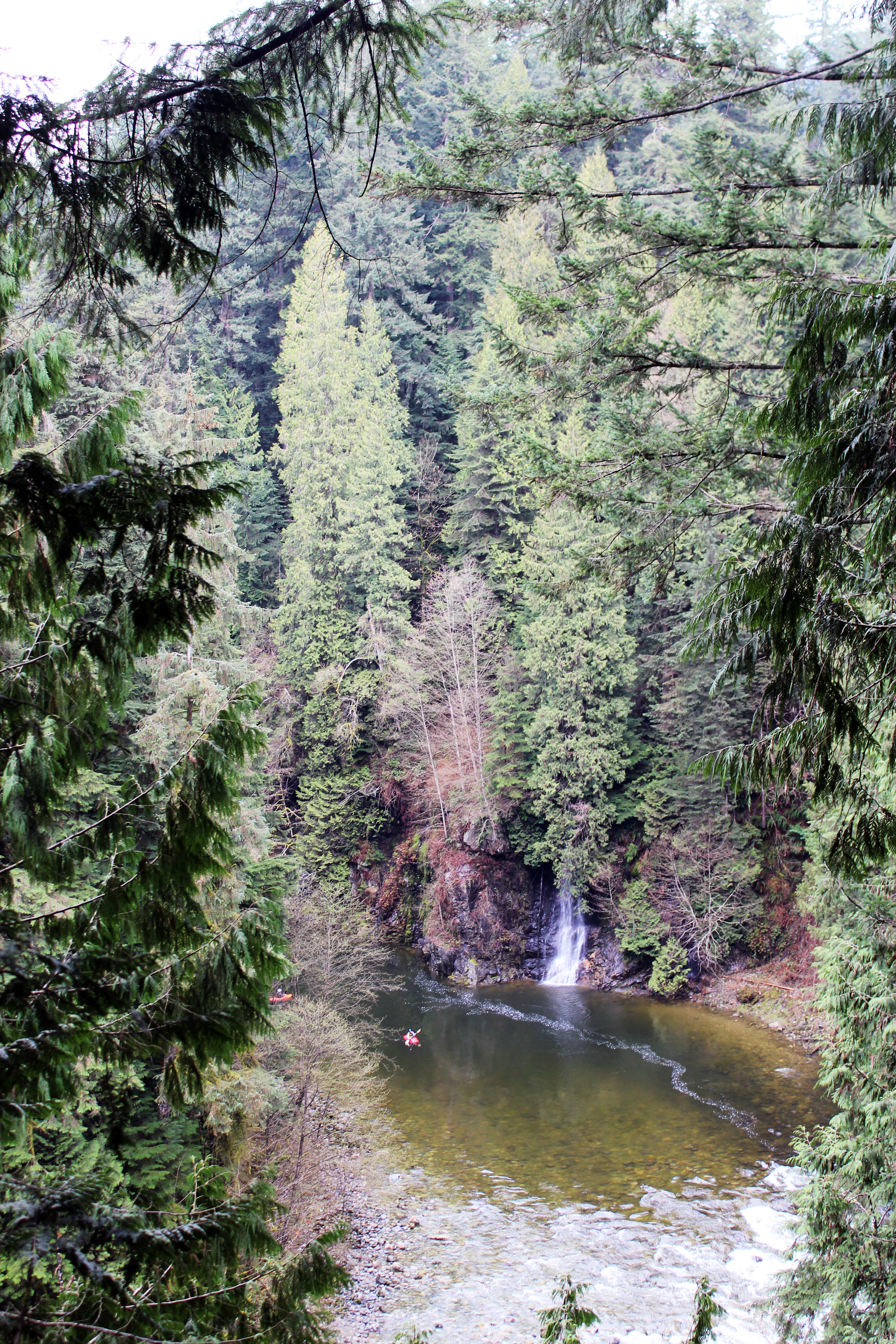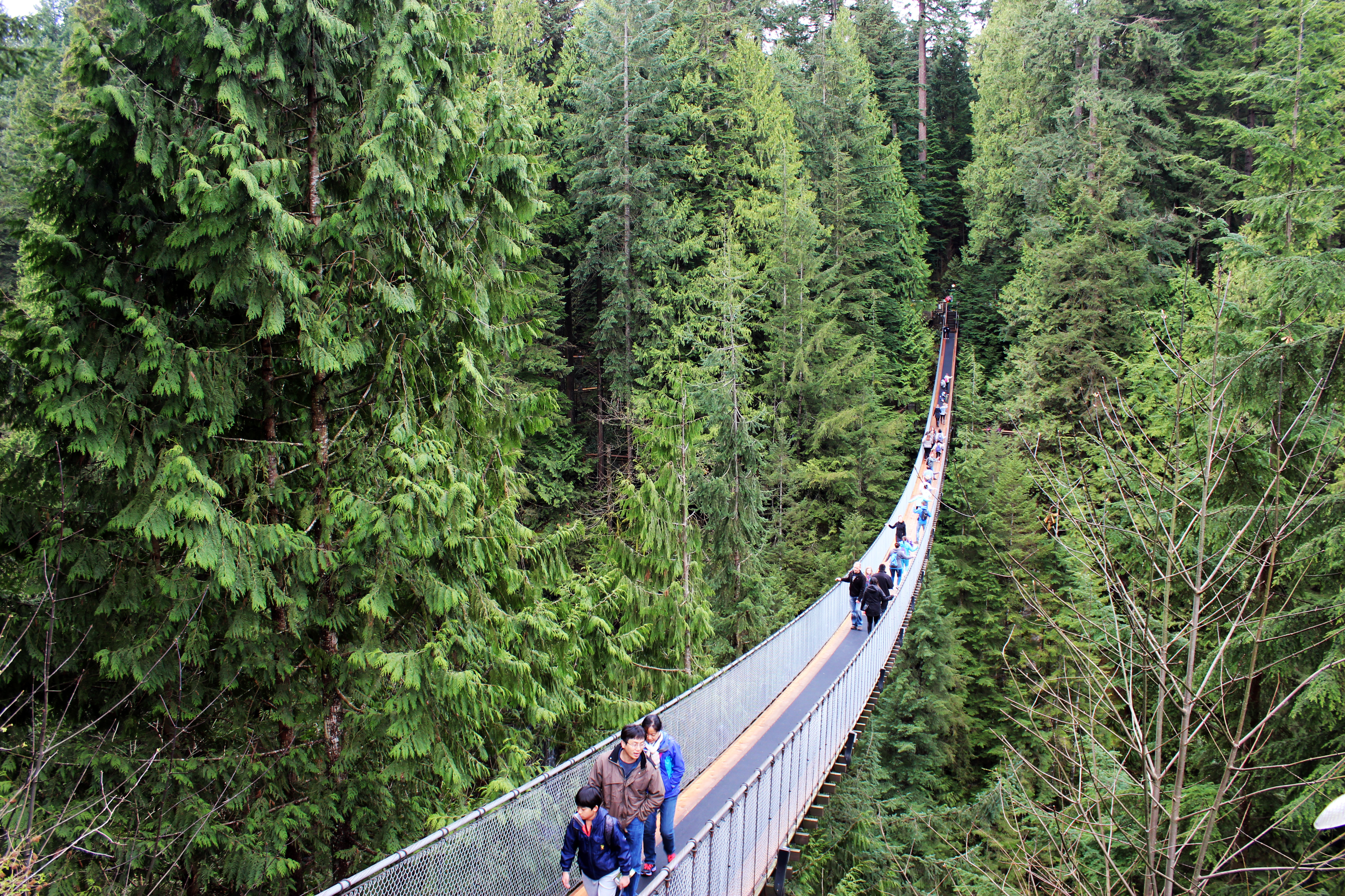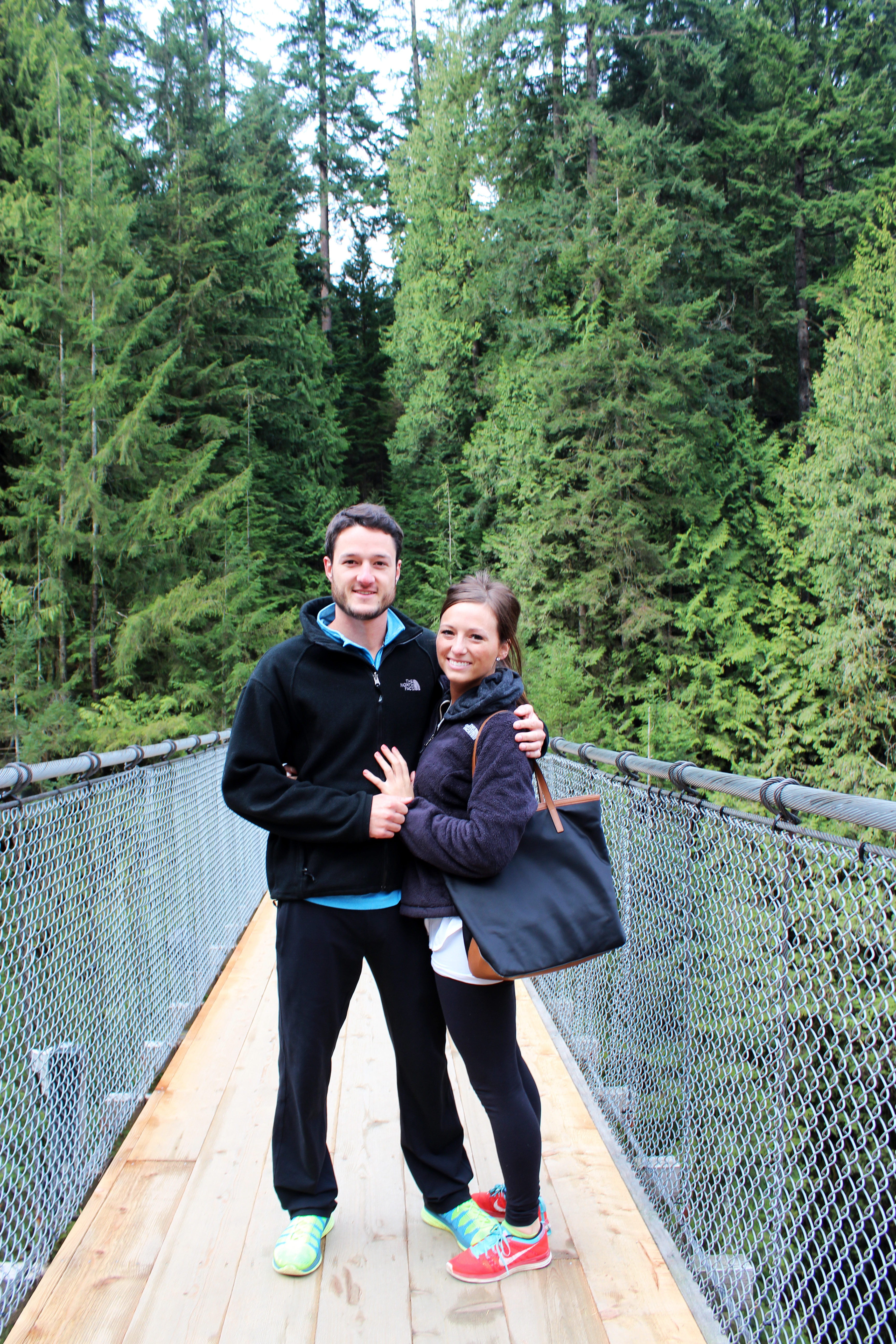We finally decided that as the day went on, the Suspension Bridge wouldn’t get less crowded so we might as well just take our time crossing. I could already see the nauseous-ness coming before even stepping on the bridge. The Capilano Suspension Bridge was built in 1889 and stretches about 450 feet across the Capilano River. And let me tell you, it’s quite high above the river too, about 230 feet. With those kinds of dimensions it’s no wonder you get a little queasy and wobbly when you step on the bridge. Getting photographs was proving to be quite challenging but we made due.