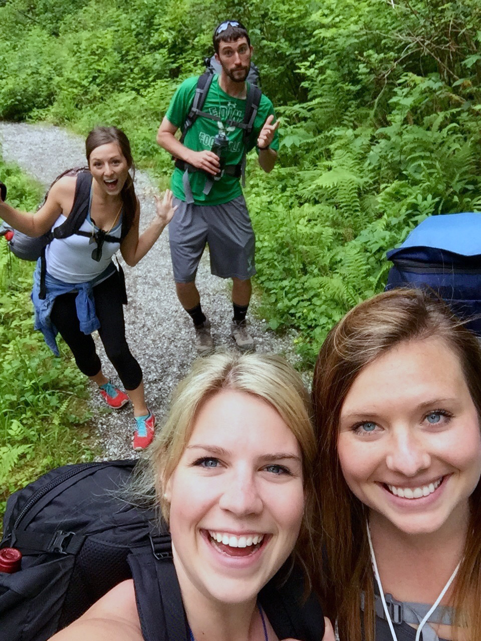 Soon, the path took us the opposite direction from the lake, which left us feeling a bit discouraged. Not long after that, the path grew very thing and soon become covered with plants, trees and weeds. WE started to joke that someone was pranking us. Is this seriously the hike we were on? There wasn’t a path anymore! How in the world we were supposed to know where we were going? We started to shout for Dan and Libby. Hoping that someone would hear us and respond. No luck. We joked about how at least wen we arrived, camp would already be set up for us and we could just bust into the s’mores and wine- wishful thinking on our end.