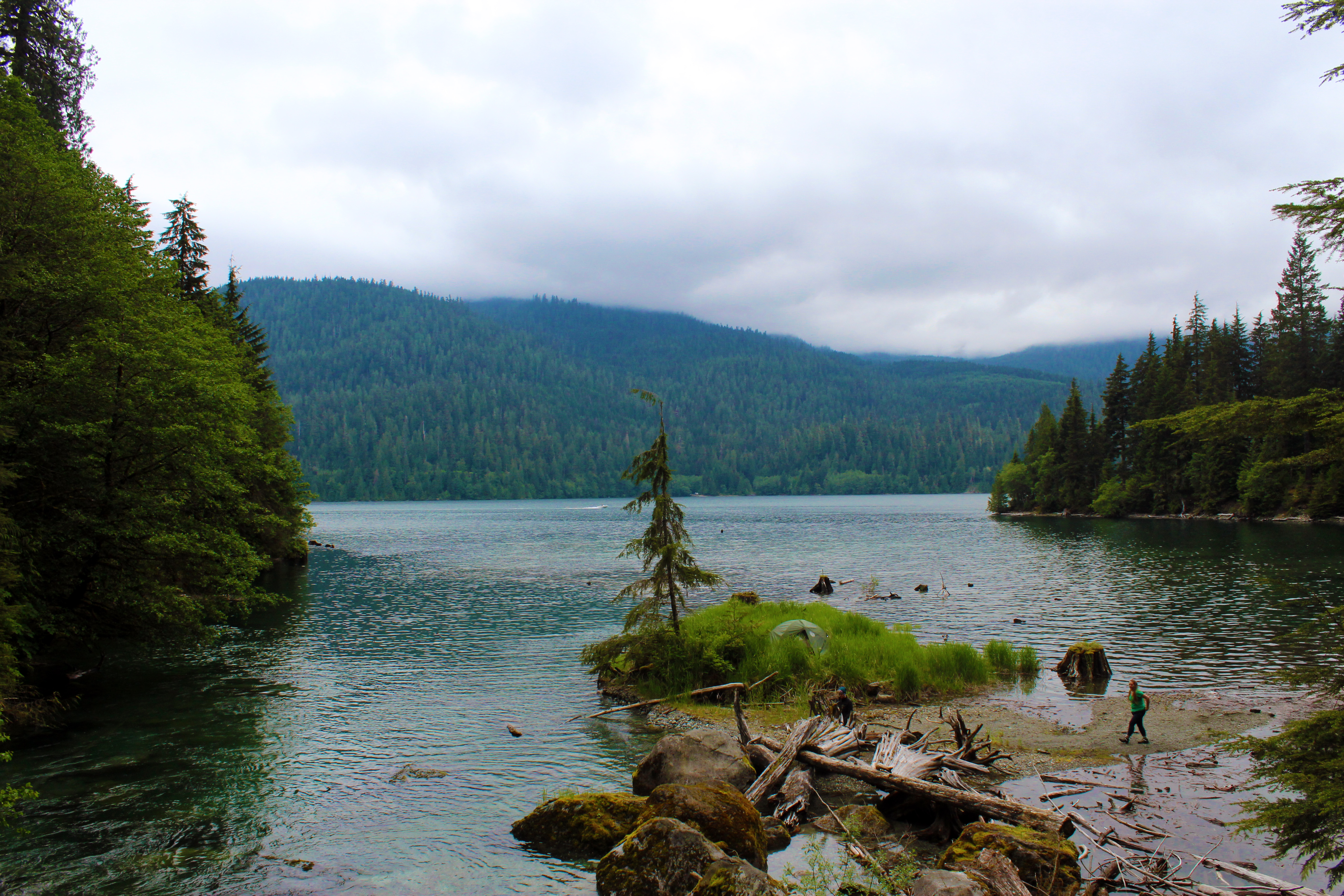 When we pulled up to our trailhead, it was like stepping into the light. Surrounding us were the greenest trees I’ve seen in a long time. A thin layer of smoky clouds came half way down the mountain creating a cool effect of patters against the nature. Stepping out of the car, my legs were cramped from sitting for so long. The drive was only meant to take 3ish hours from Seattle, but seemed much, much longer with the pit stops. I was ready to get into the woods, set up camp, drink some wine and enjoy the company with my friends.