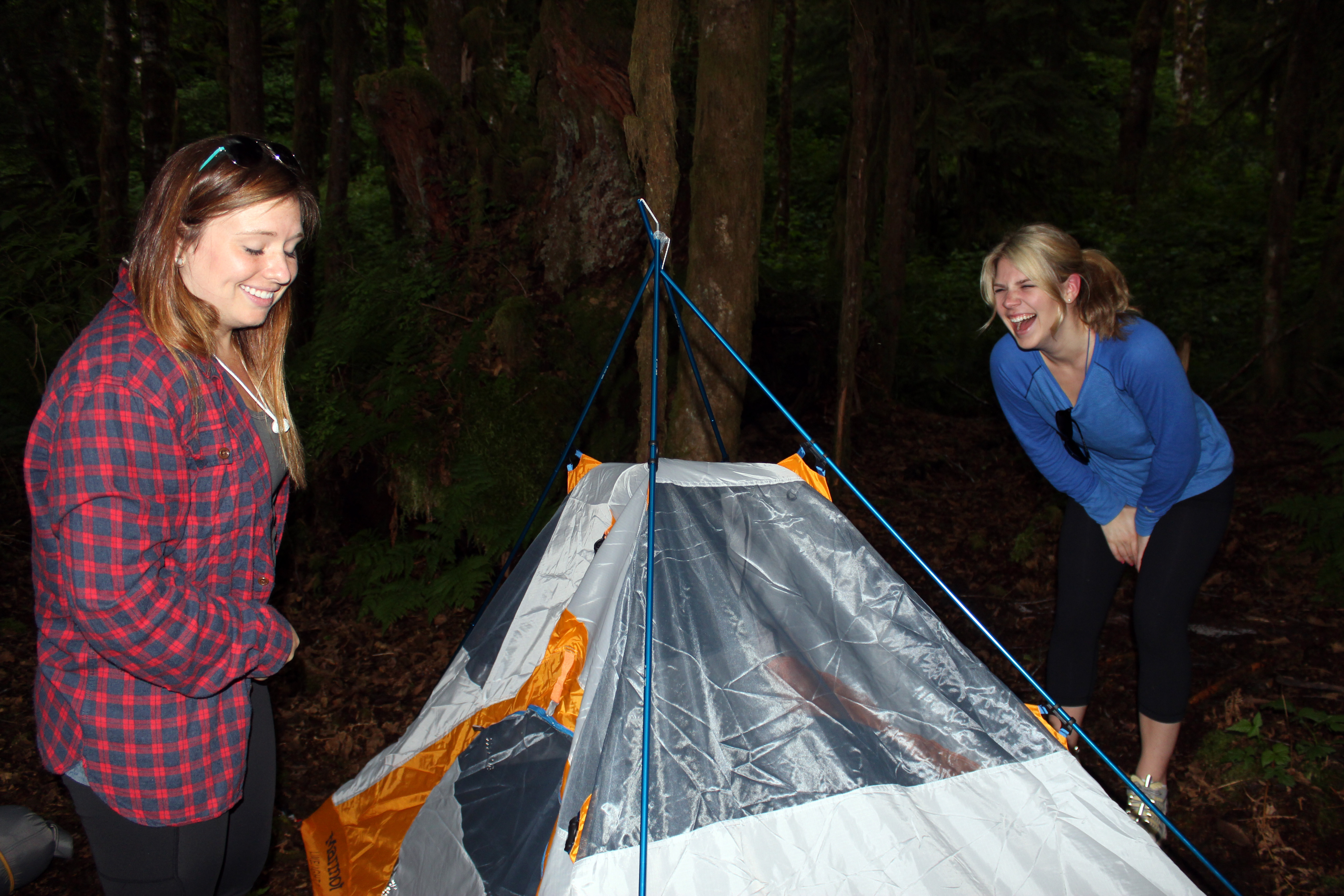 No time to relax, yet. Before we could completely unwind, we had to set up camp. Libby took charge and ordered Kathleen and I to come and help her. She was on to us. Back in New Zealand, Kathleen and I would be laughing too much to ever help; she wasn’t about to let us get away with that now. The three of us took one look at the tent and I immediately started cracking up. We had no idea what we were doing. No directions to follow, we just started clipping pieces in. Stepping back to admire our work, the three of us were laughing so hard. It was just all-wrong. The “tent” we had set up was about 3 feet high and had a lop-sided top. Nothing remotely close to what a tent should look like. Taking deep breaths to try to control the laughter, we tried again. This time, we managed to figure it out.