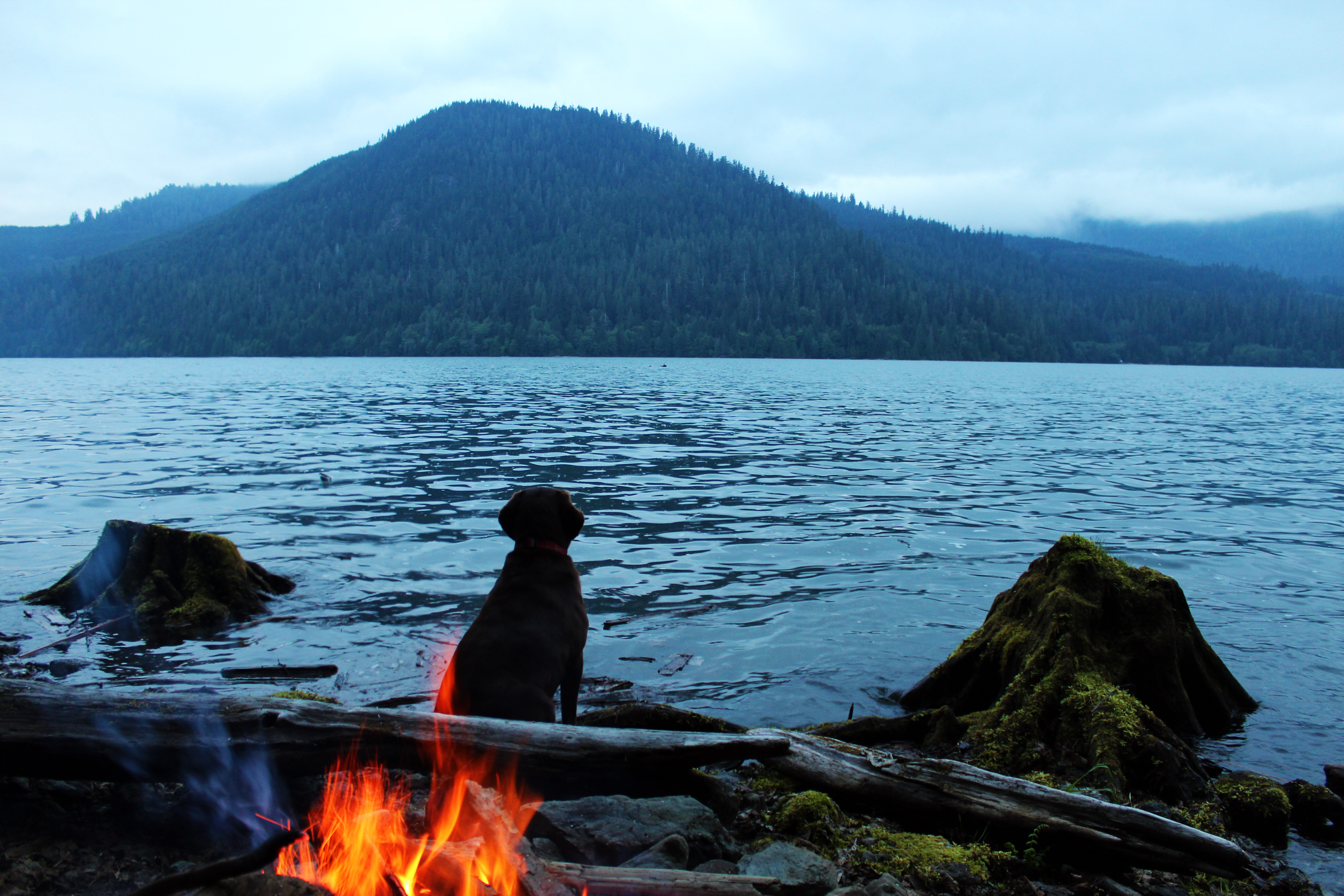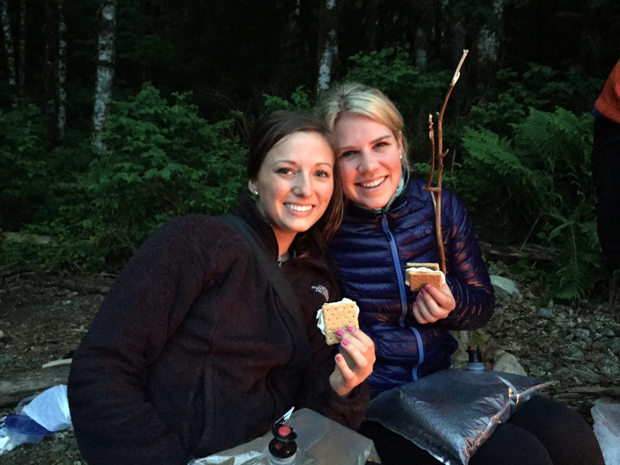 Back at the waterfront, the boys were trying to get a fire started. The ground, sticks and branches were damp from the PNW moist air and leftover rain residue yet they somehow managed. Bravo boys! Charlie was hilarious to watch. He would sit on the edge of the water, gazing into the mountains as if he was contemplating his dog life. What a cutie. Unloading the food was the next step. Brats and corn to grill over the fire was on the menu. Kathleen and I of course, also needed s’mores. We opted out of brats once we saw the smashed meat. It looked less than appealing. Libby managed to make them taste good. She found a nice stick and slowly roasted them one by one. Wrapping in a tortilla, we had home made camping sandwiches, none for me thank you.