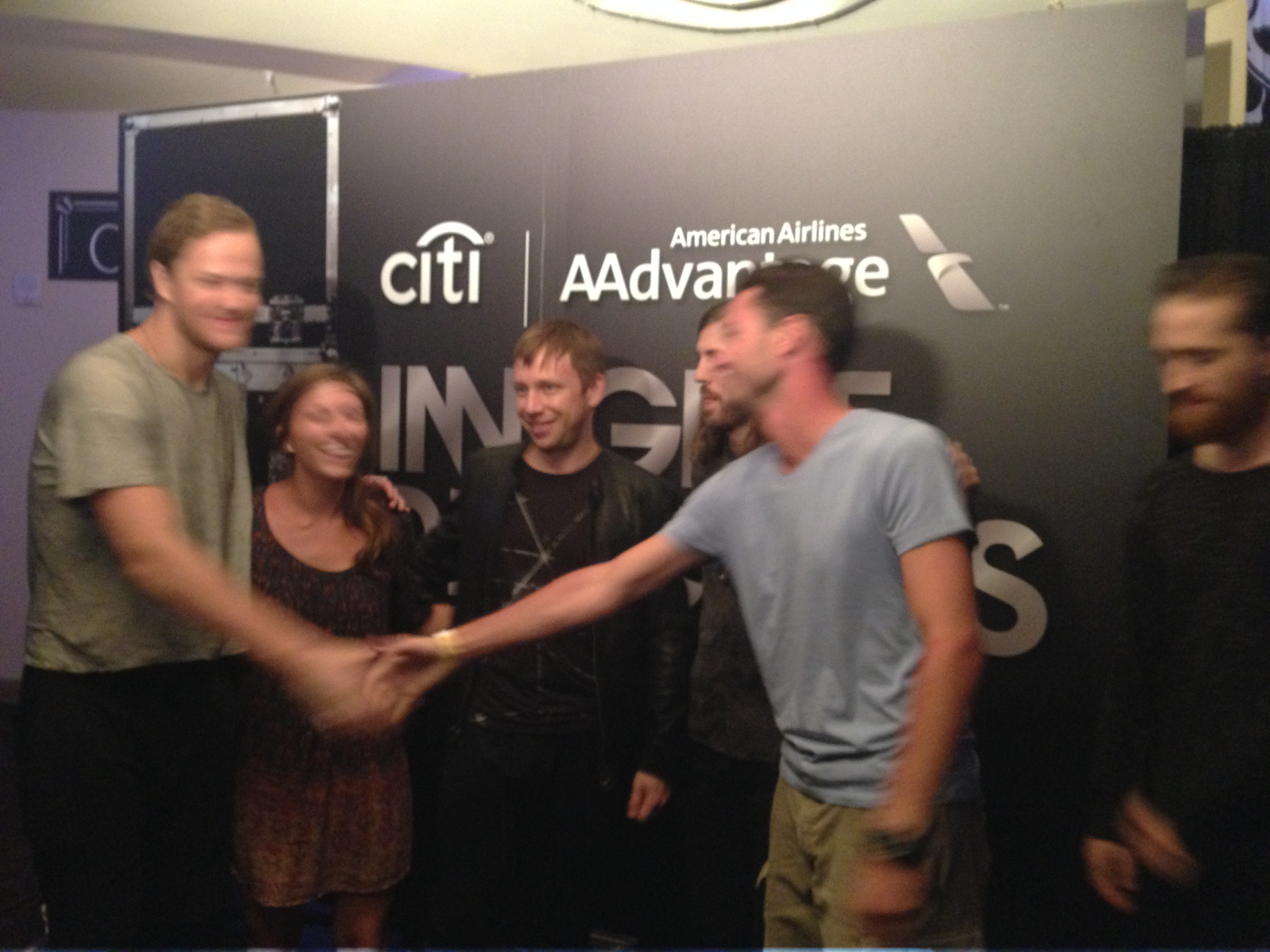 After we wrapped, we assumed we were done helping her out. Little did we know she had much more in mind for us. Filming us walking the red carpet, past the elaborate Imagine Dragons lit up signs and hedges, she slipped some meet and greet bracelets on us and marched us inside the venue. Citi was making sure its customers were getting the all-star treatment tonight. The old, historic venue was decorated like nothing short than an A-List event. Red carpets decorated the sidewalk leading into the venue, chandeliers sparkled from the beams of light that spewed across the entry and the bands name was lit up and plastered tastefully around the venue. Small and intimate, most of the fans would be housed downstairs with a select few “VIPs” on the sides upstairs. Sarah and her crew kept the cameras rolling as they took Dave and myself up to the private Citi Corporate event and introduced us to the band. The whole time, Dave and I kept looking at one another- both a little in shock of the events that were unfolding in front of us.